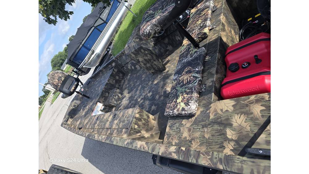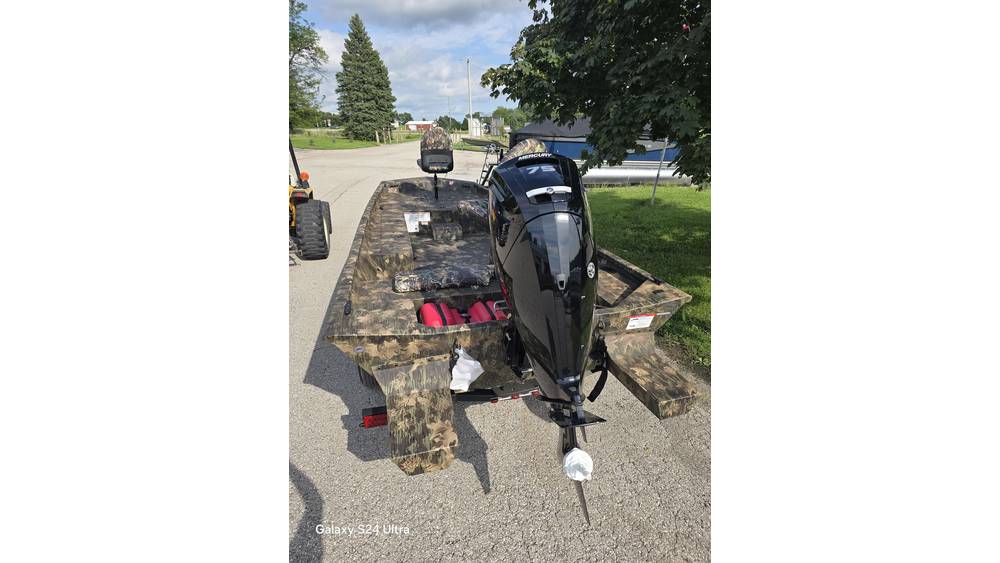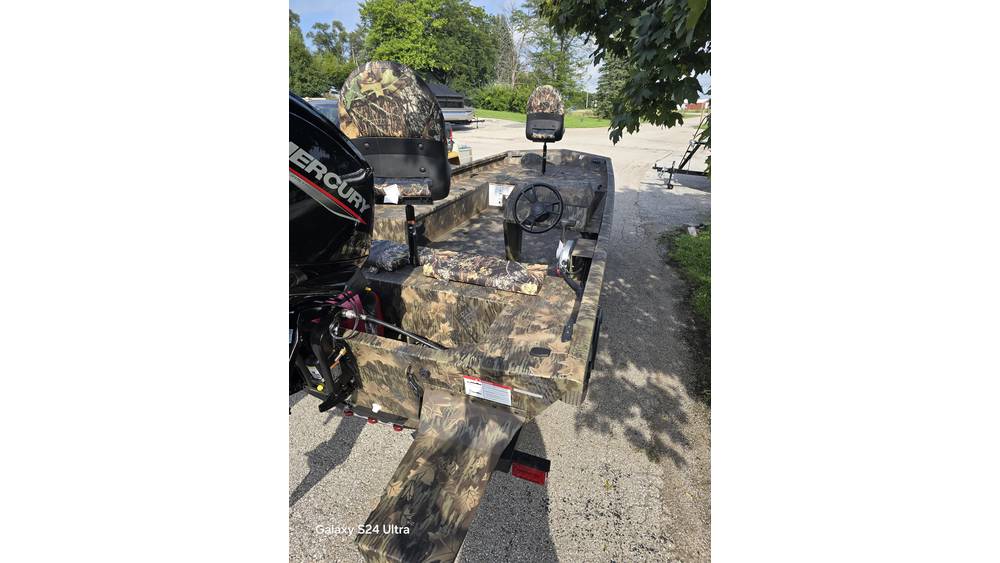 Packaged with all standard features plus. Upgraded to a Mercury 60HP. mossy oak break up paint, 2 ped fold down fishing seats, 72" port rod/gun box, sponson pods, step box, battery, aluminum prop, Karavan trailer with swing tongue, roller load guides and transom tie downs.