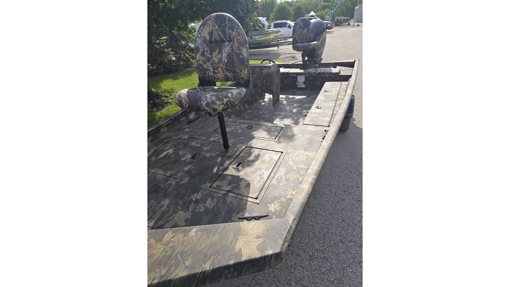 Packaged with all standard features plus. Upgraded to a Mercury 60HP. mossy oak break up paint, 2 ped fold down fishing seats, 72" port rod/gun box, sponson pods, step box, battery, aluminum prop, Karavan trailer with swing tongue, roller load guides and transom tie downs.