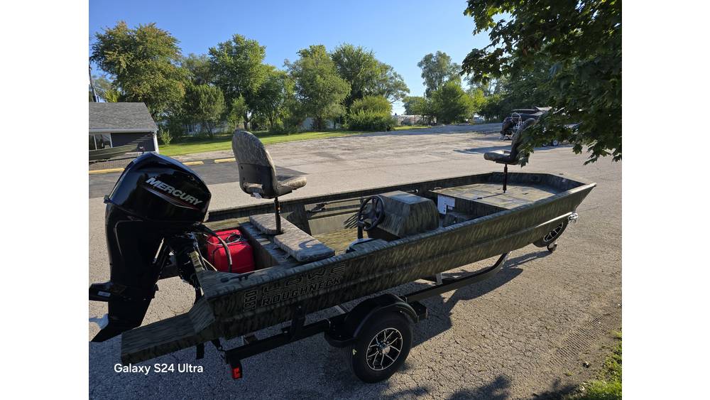 Packaged with a Mercury 60HP 4 stroke, 2 ped fold down fishing seats, sponson pods, step box, battery, aluminum prop, Karavan trailer with swinge tongue, roller side guides, transom tie downs and spare tire.